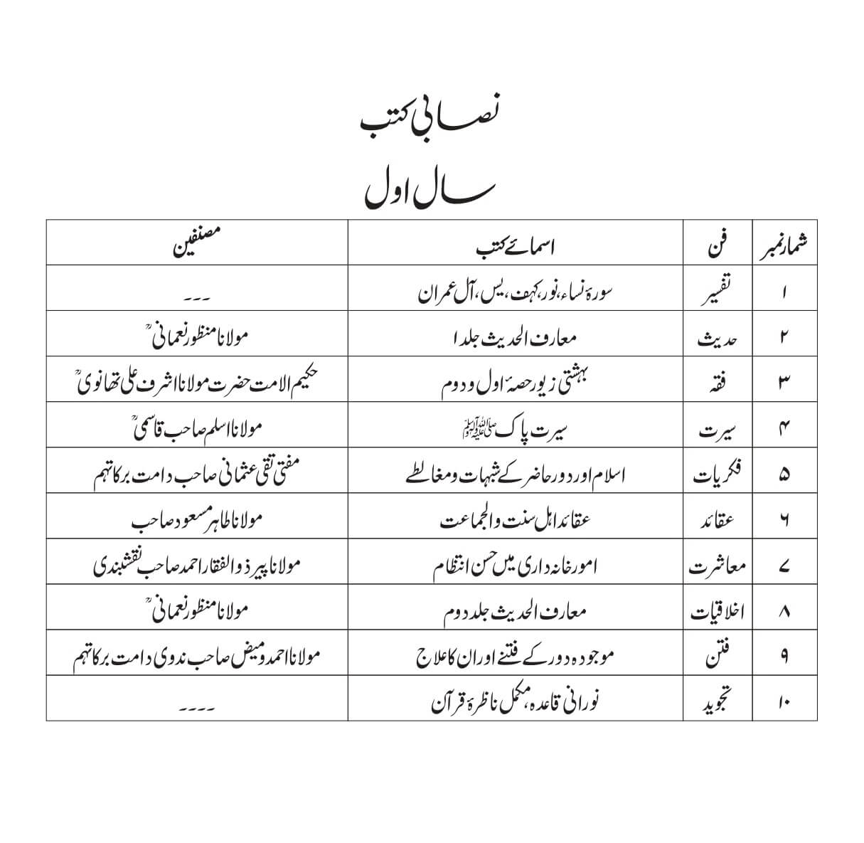 (۱) قرآن مجید بالتجوید (۲) تفسیر (۳) حدیث مع تشریح (۴) فقہ (۵) عقائد (۶)فکریات